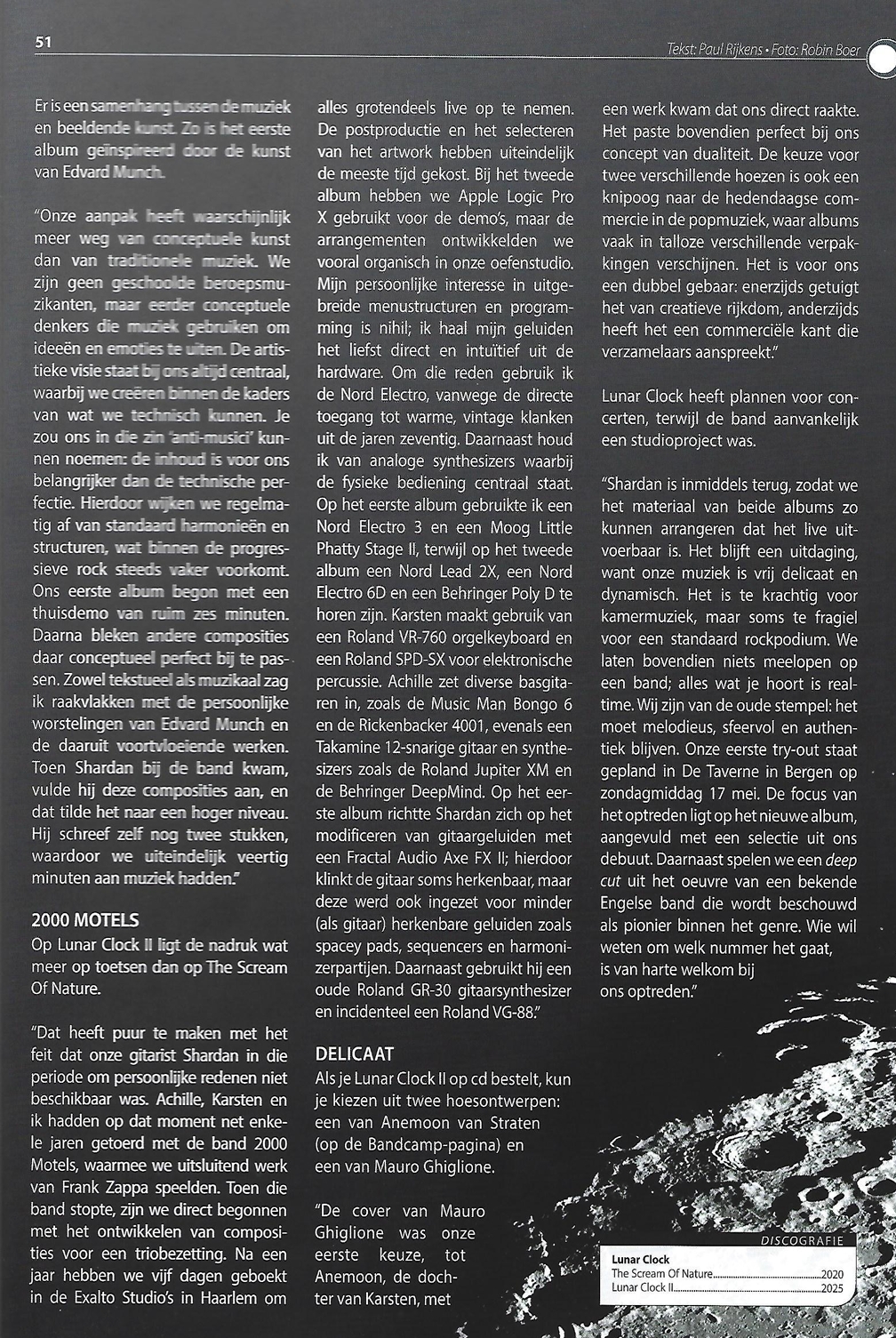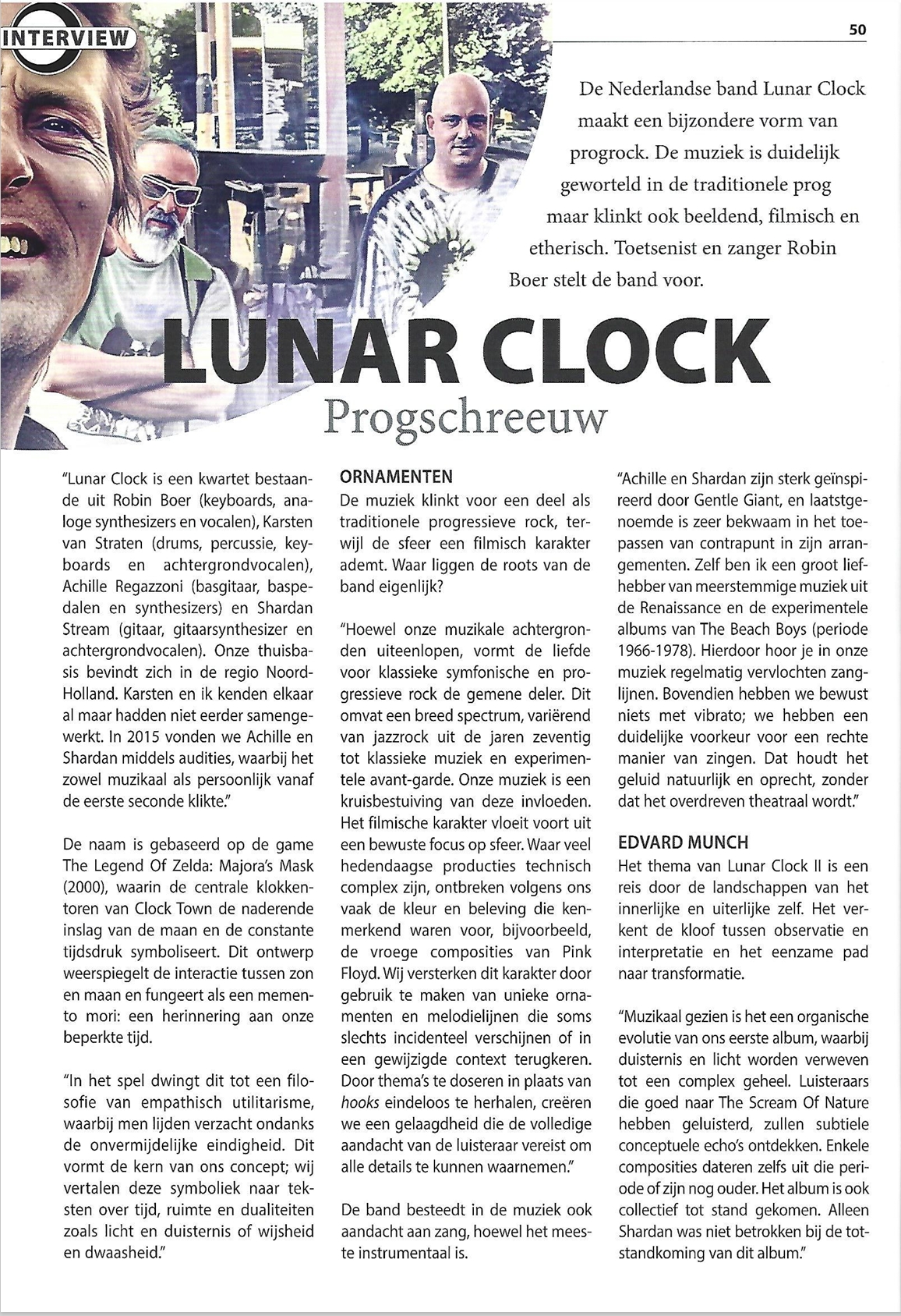 “Lunar Clock is een kwartet bestaande uit Robin Boer (keyboards, analoge synthesizers en vocalen), Karsten van Straten (drums, percussie, keyboards en achtergrondvocalen), Achille Regazzoni (basgitaar, baspedalen en synthesizers) en Shardan Stream (gitaar, gitaarsynthesizer en achtergrondvocalen). Onze thuisbasis en ons werkveld bevinden zich in de regio Noord-Holland. Karsten en ik kenden elkaar al, maar hadden nog niet eerder samengewerkt. In 2015 vonden we Achille en Shardan middels audities, waarbij het zowel muzikaal als persoonlijk vanaf de eerste seconde klikte. De eerste schetsen van wat uiteindelijk ons debuutalbum werd, kregen overigens al in 2012 vorm.”